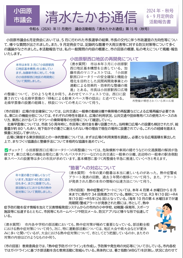 皆様こんにちは。小田原市議会議員の清水たかおです。