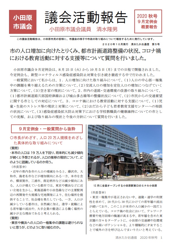 皆様こんにちは。小田原市議会議員の清水たかおです。