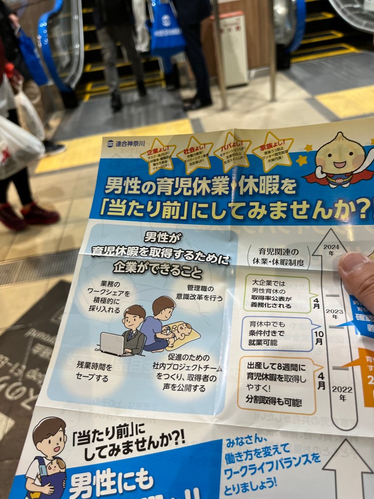 本日は、#連合神奈川 の日でした。今回は職場の働き方改革として、[男性の育児休業・休暇を当たり前に]のチラシを配布しました。#小田原足柄地域連合 に結集する働く仲間の皆さんとともに、小田原駅東口駅前をご通行中の皆さんに、声掛けをしながらチラシを手渡しました。